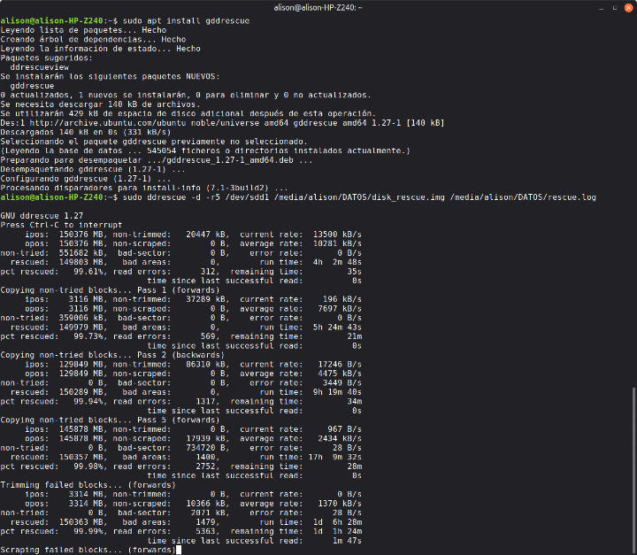 Phase 3: Scraping It tries multiple read strategies on the worst sectors. This phase is slow and can take hours or even days for heavily damaged drives.